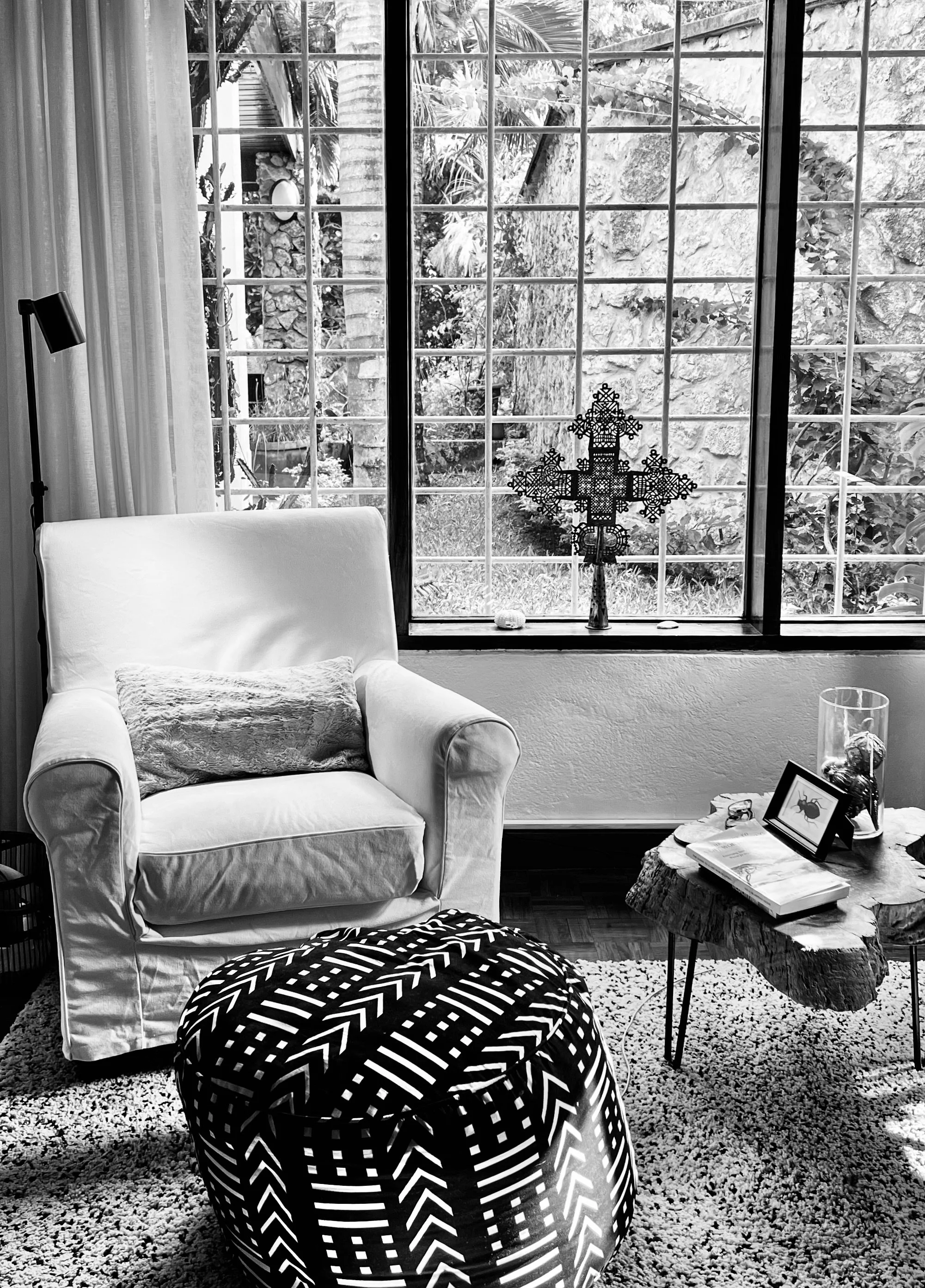 From this chair, in my former home in Tanzania, I wrote The Oak Alley Trilogy. It’s a simple white armchair with a pouf in front, but for me it became the place where stories were born. I need to sit with my feet up and the laptop on my lap to really get into the flow of writing. Every morning for three years, some days as early as 4 am, I curled up here and disappeared into another world.